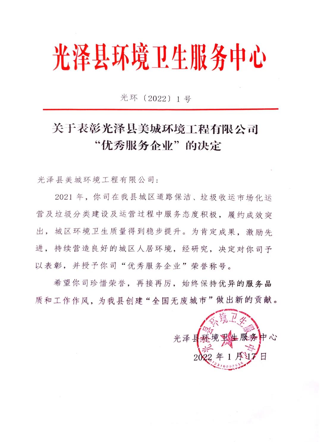 美城环境屏南项目收到屏南县城市管理局下发“优秀服务企业”荣誉。